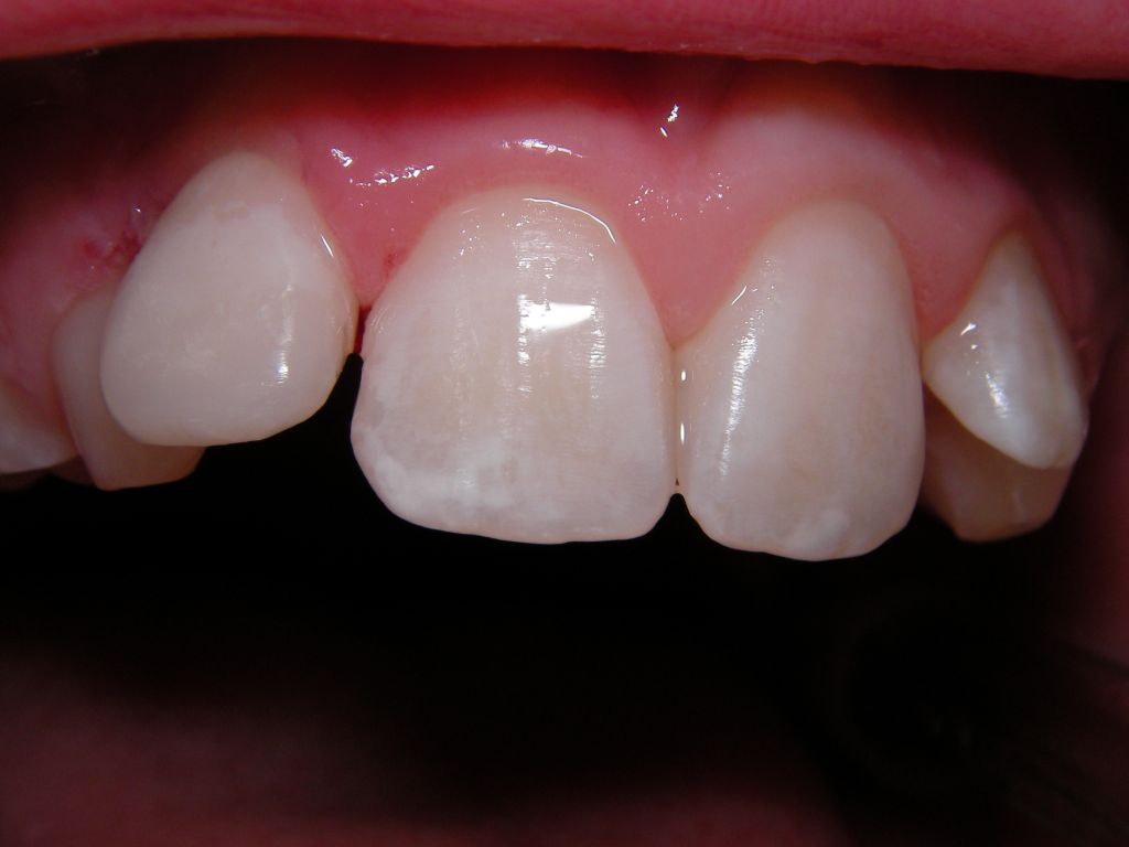 Am benachbarten Zahn 42 wurde die Rand- und Füllungsverfärbung einfach durch Politur entfernt - eine Erneuerung der Füllung war nicht notwendig. Eine Zuzahlung für den Kassenpatienten ist hier nicht angefallen. Alle Defekte des Eckzahnes zusammengenommen sind so groß, daß man sicherlich auch eine Krone hätte vertreten können. Hier ein weiterer Fall, ein junges Mädchen nach einem Schulunfall: